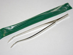 High quality collectors tweezers by Showgard, bent, spade shaped end.