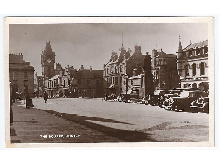 Real photographic postcard of The Square in Huntly with parked vintage cars, in good condition, slight corner discolour bottom left.