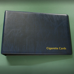Supplied with 30 safe high quality polypropylene pages, holding 10 cards per page up to 42mm x 82mm each. Blue padded binder with 2 D rings and gold blocked text on the front cover. Extra pages for most different sizes of cigarette cards are also available.